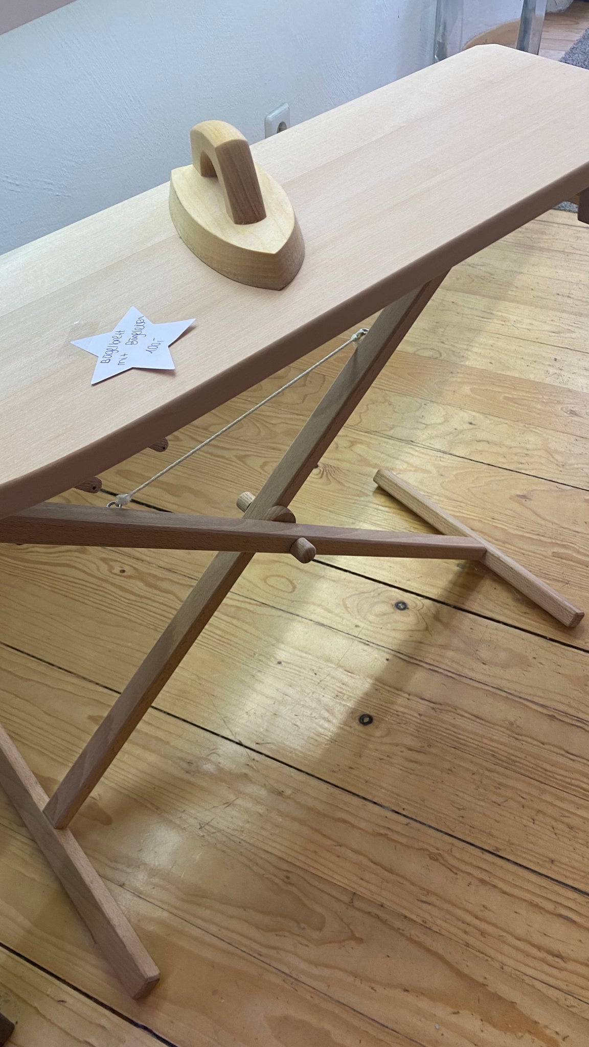 Mit dabei ist ein hübscher Baumwoll-Bügelbrettbezug sowie ein passendes Spielzeug-Bügeleisen aus Holz 🪵🧡