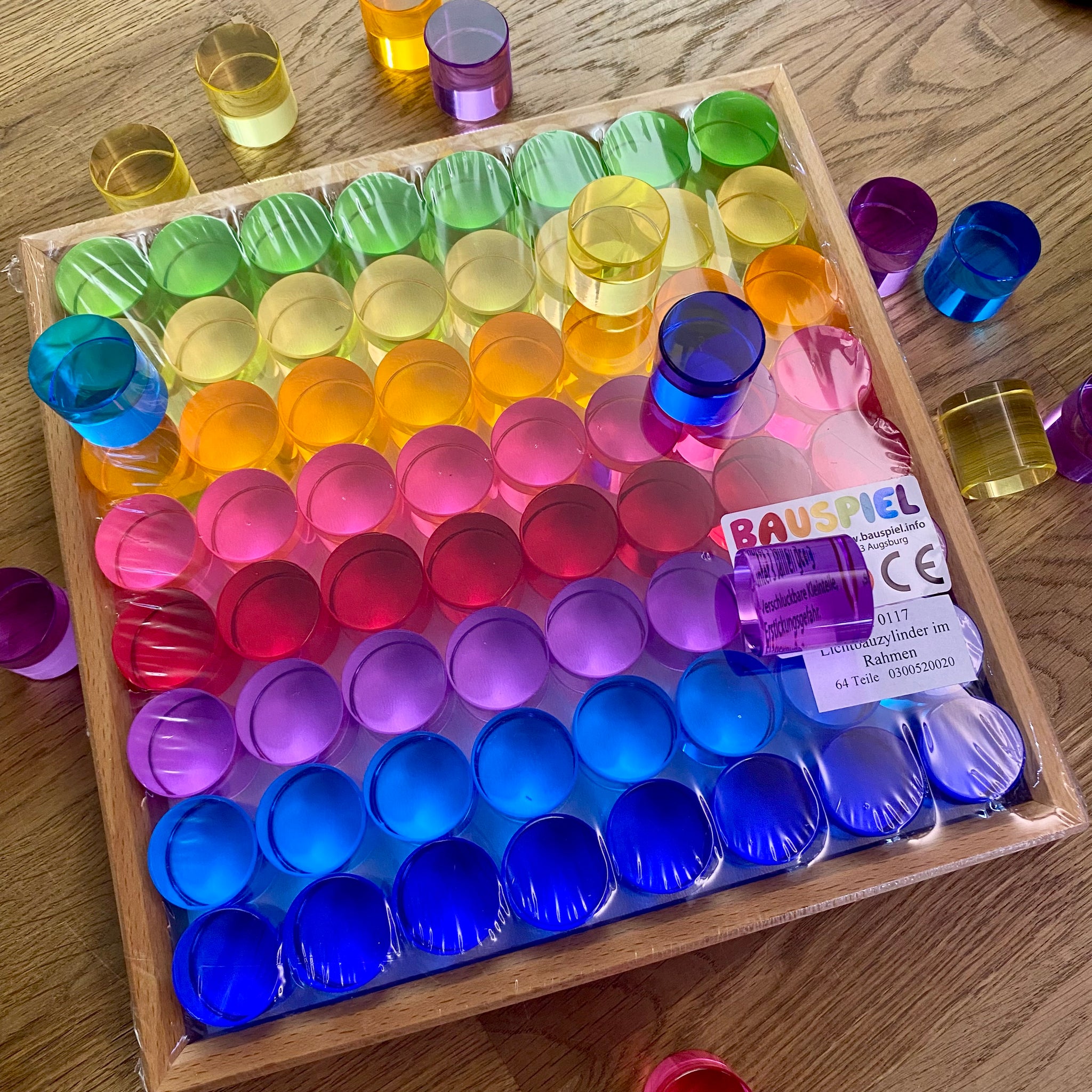 Dieses farbenfrohe Set lädt Kinder dazu ein, ihrer Kreativität freien Lauf zu lassen! Die 64 Lichtbauzylinder in acht leuchtenden Farben sind in einem stabilen Holzrahmen sortiert und bieten unzählige Möglichkeiten zum Bauen, Kombinieren und Experimentieren. ✨🧱
